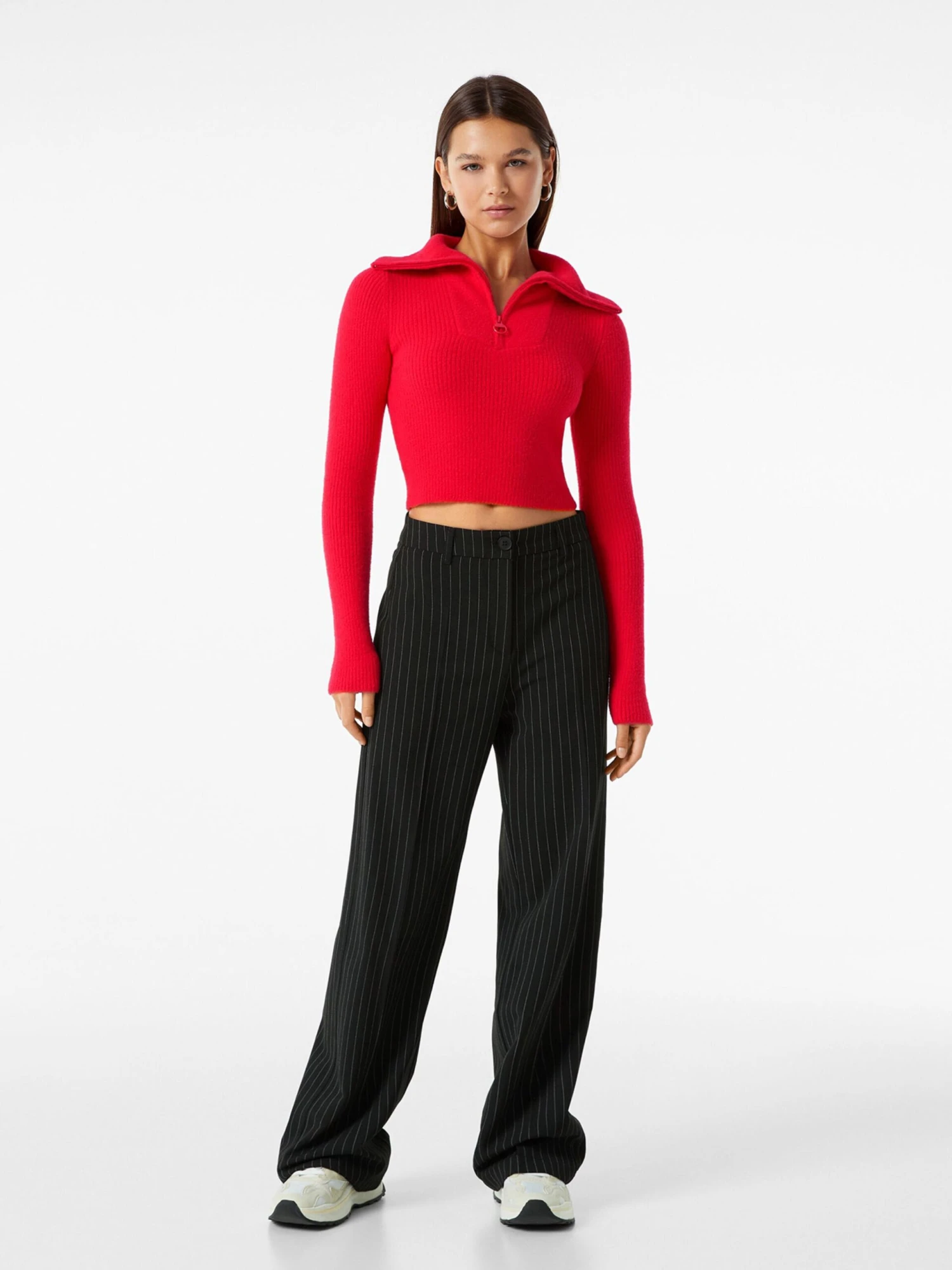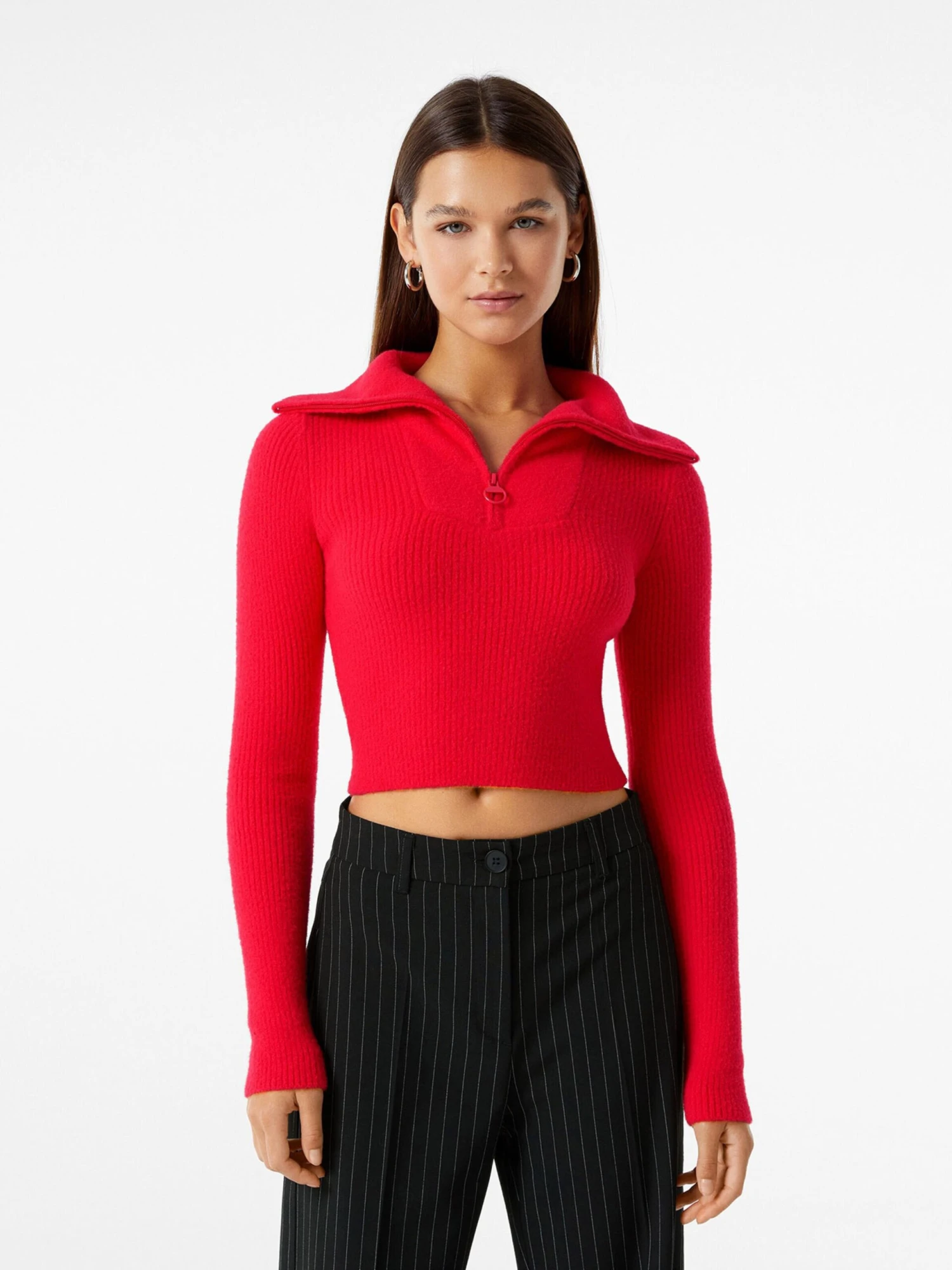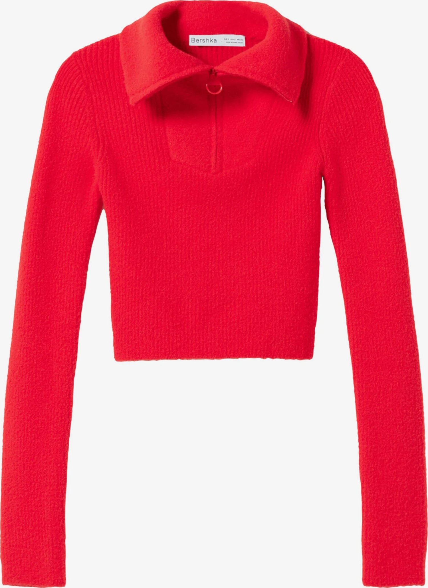EffenSchipperskraagRechte zoomTurn-down kraagHalve ritsOp staal nadenMet textuurVoelt zacht aanRitssluiting