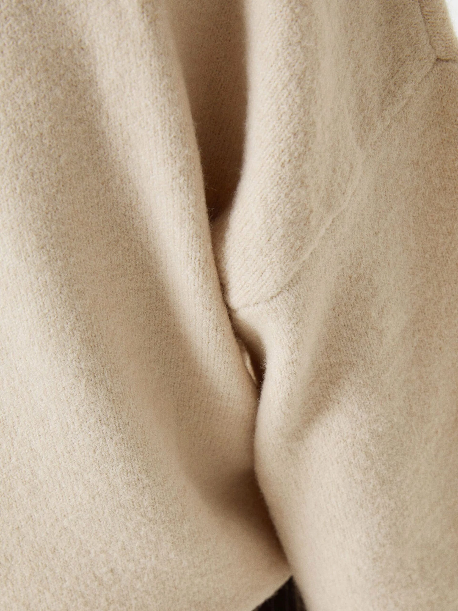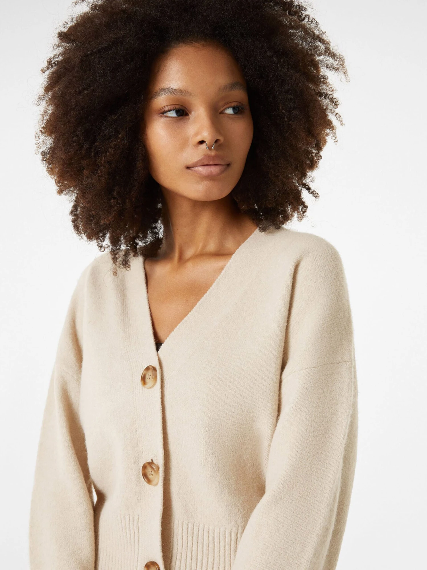 EffenV-halsKnop placketGeribd ceintuurtjeOvercut schouderFully fashionedVoelt zacht aanKnoopsluitingGerecycled polyester