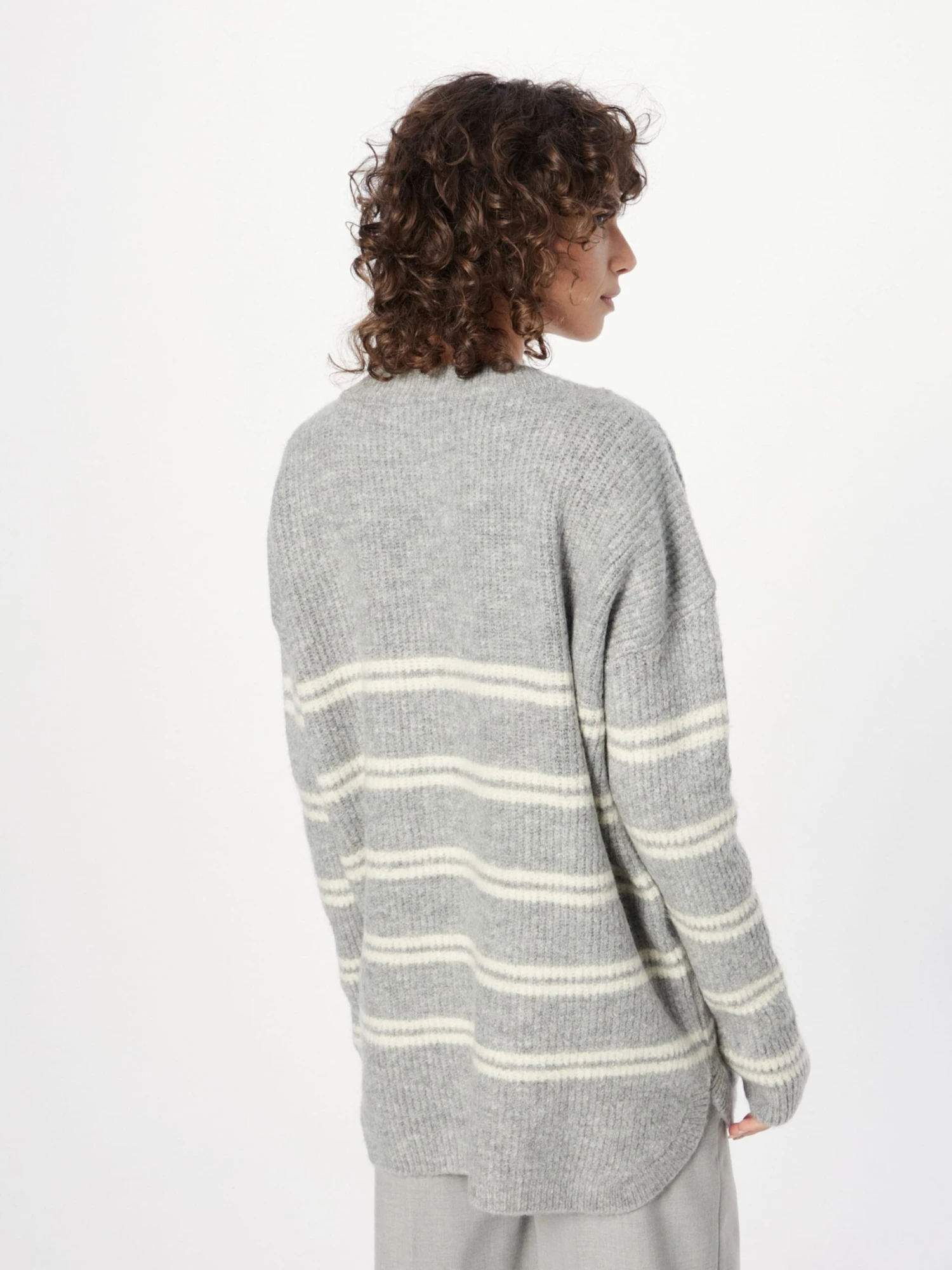 GestreeptV-halsGeribbelde kraagGeribd ceintuurtjeOvercut schouderAll-over patroonFully fashionedMet textuur