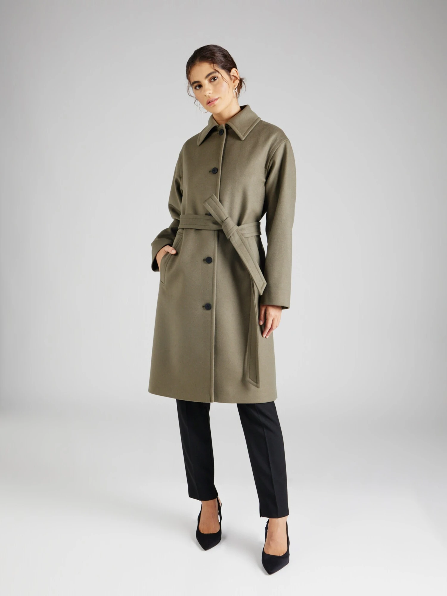 EffenWolKlassieke mantelKnop placketTurn-down kraagZakken aan de zijkantTailleriemKasjmierVoelt zacht aanLicht gevoerdKnoopsluiting