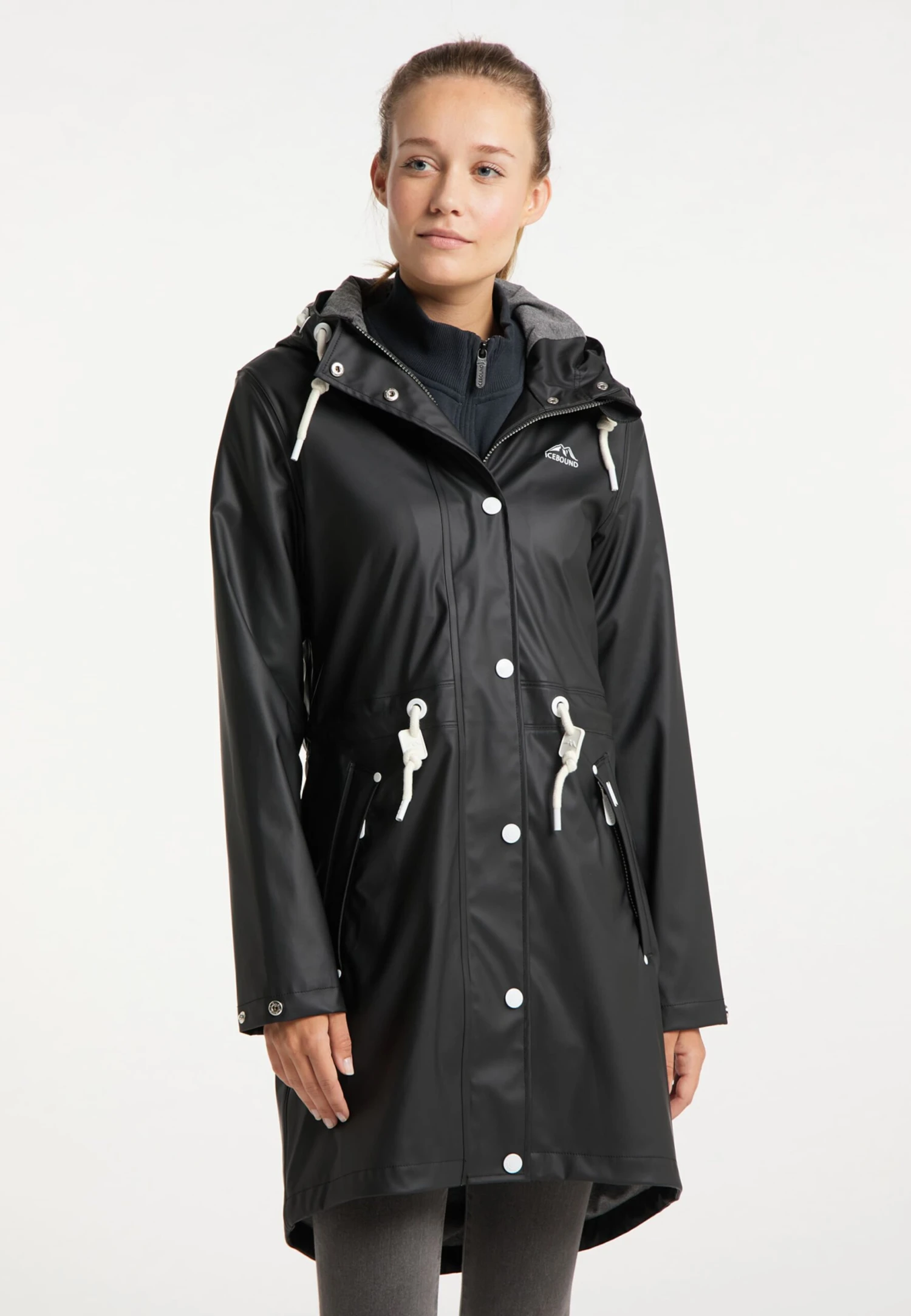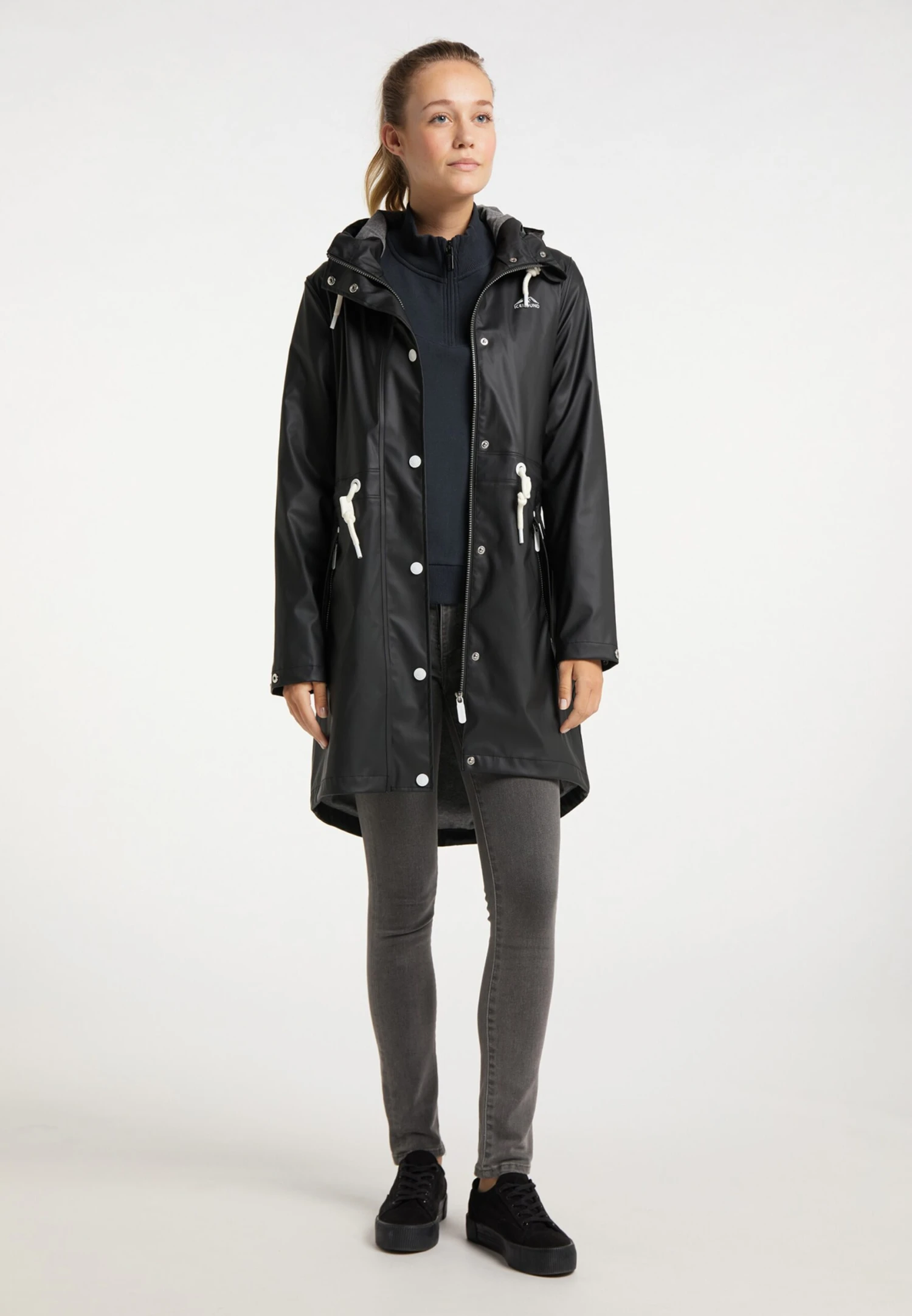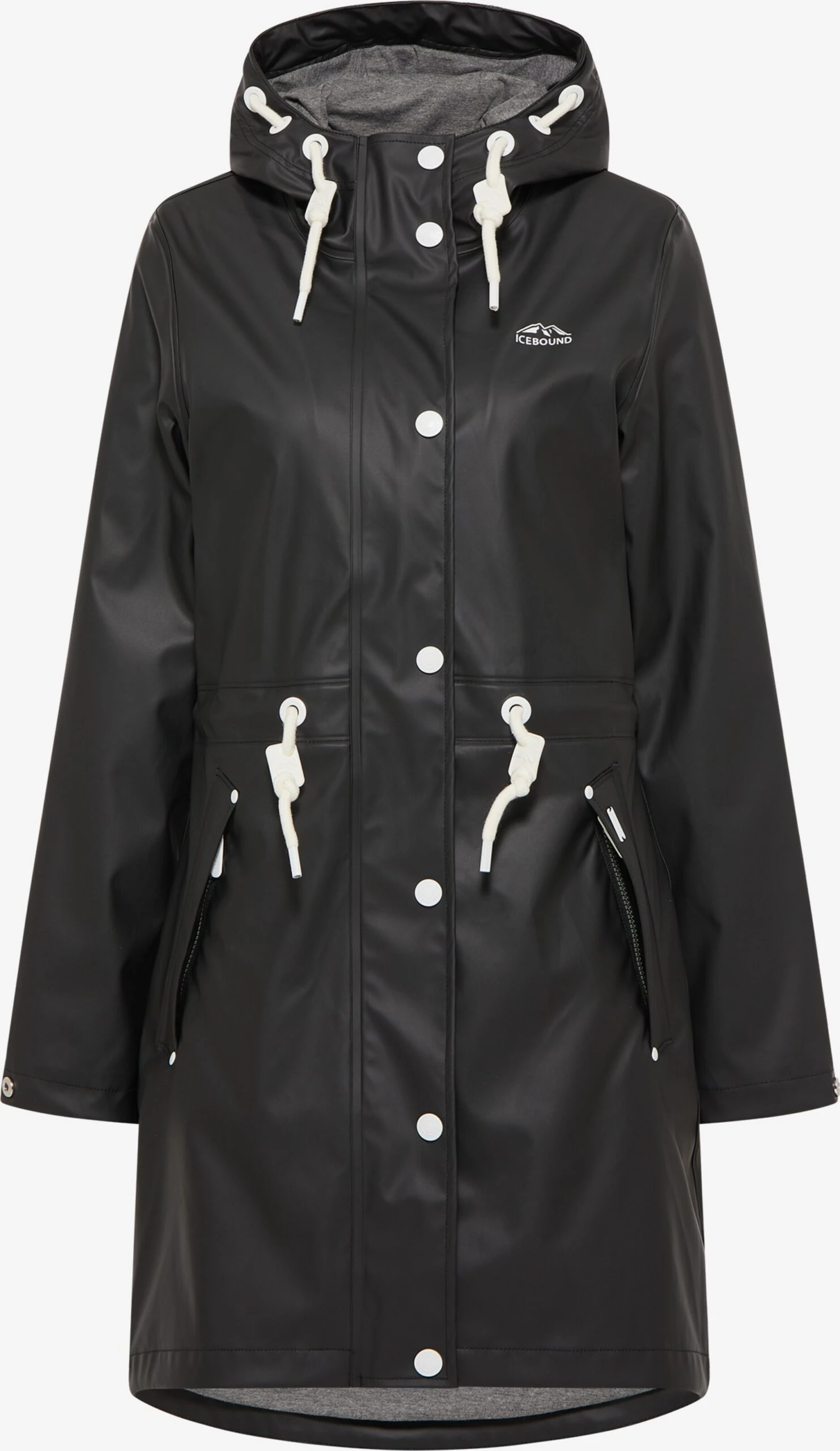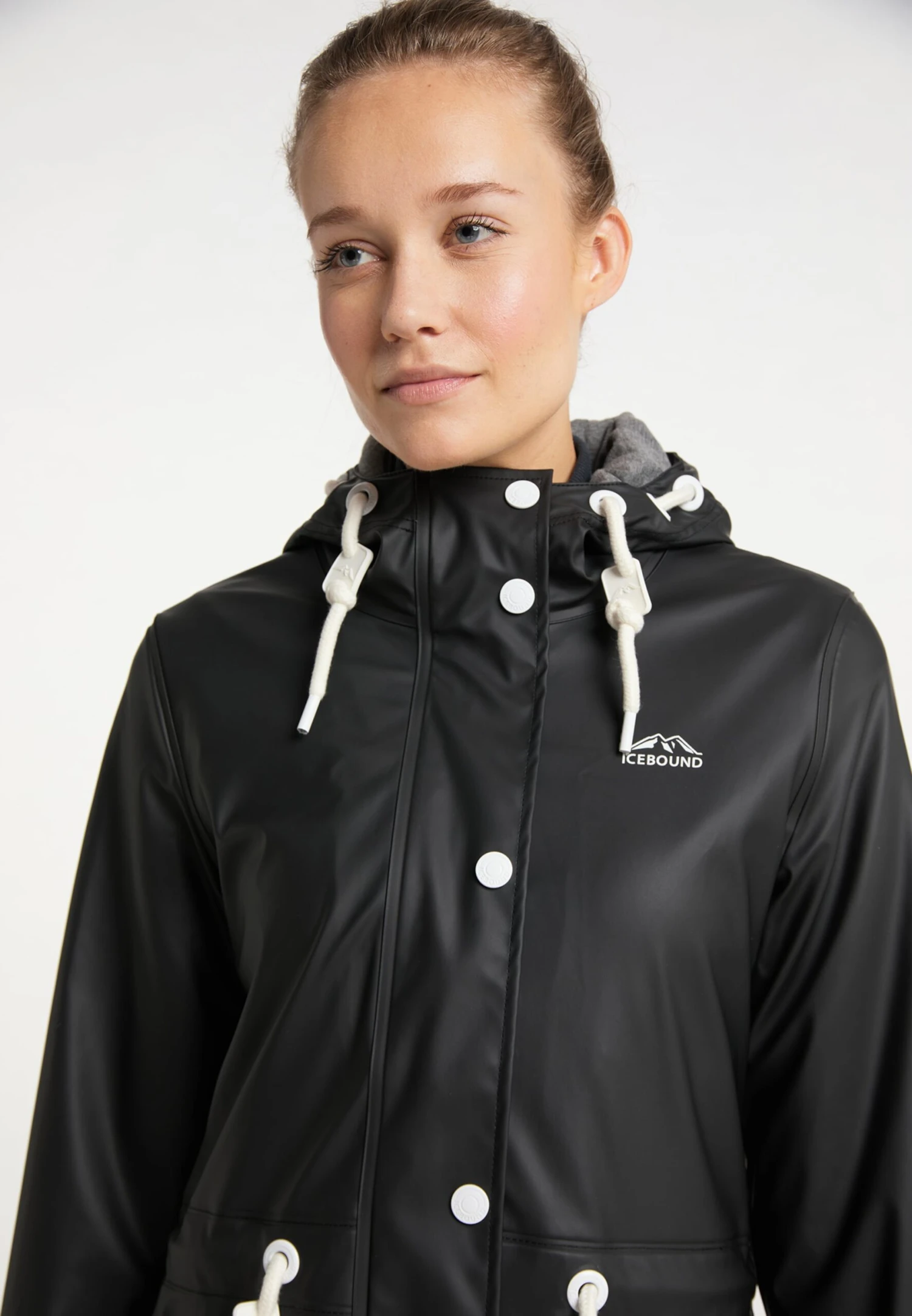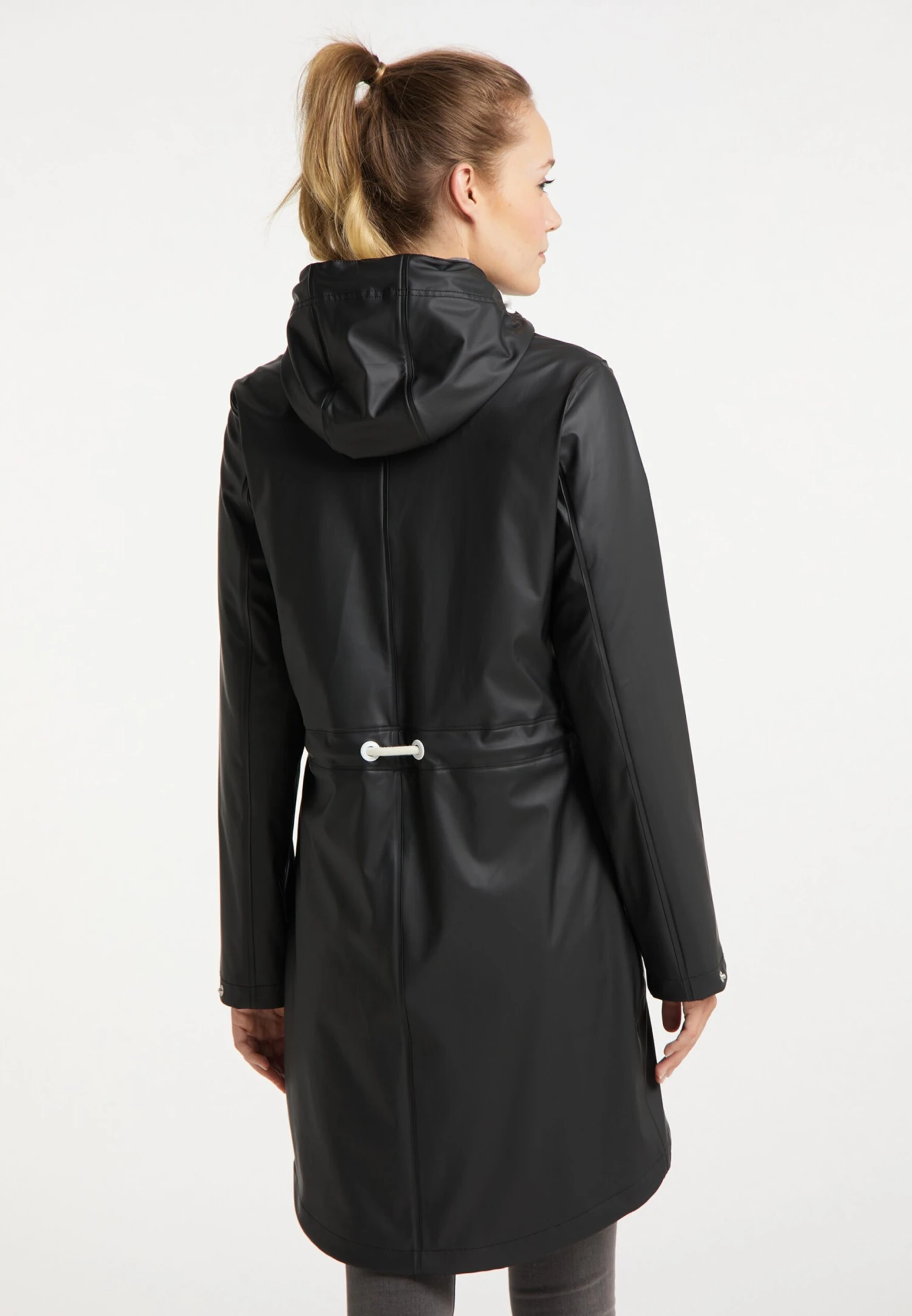 EffenImitatielederRegenjasRegenjasDrukknopenCapuchon met trekkoordVerborgen ritsRitszakken aan de zijkantVerstelbare tailleGladde stofMetalen oogjesLicht gevoerdDrukknoop