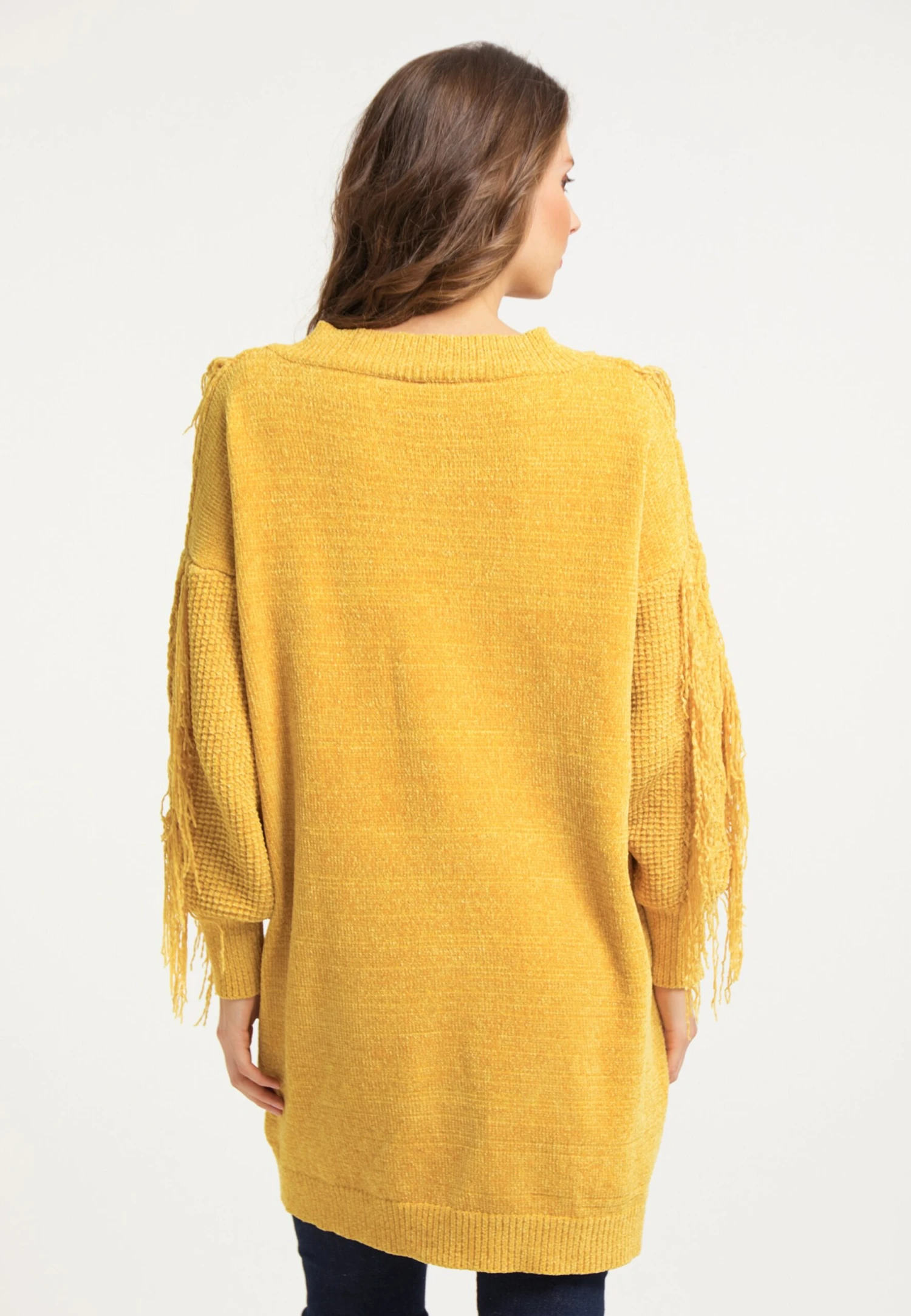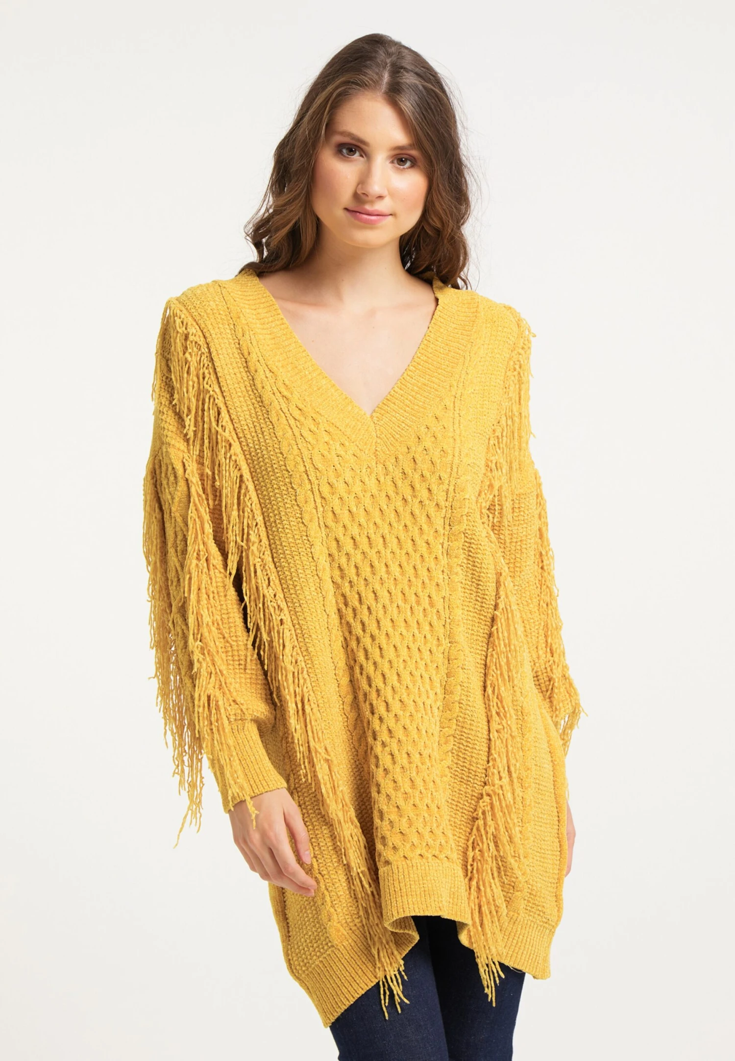 EffenV-halsFranjesGeribbelde kraagGeribd ceintuurtjeDiepe snit/decolletéOvercut schouderVlecht breiHigh-low zoomFully fashionedVoelt zacht aan