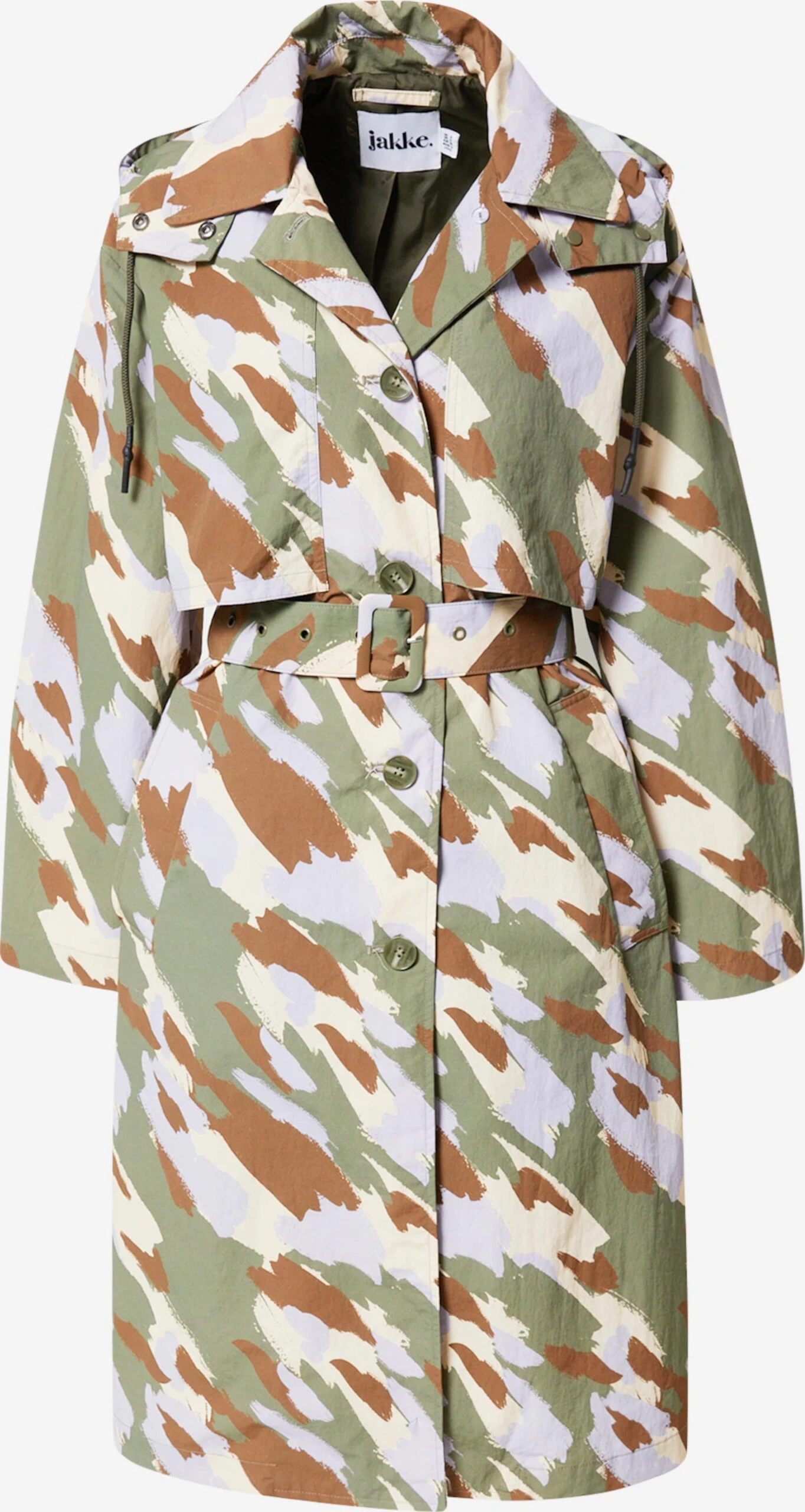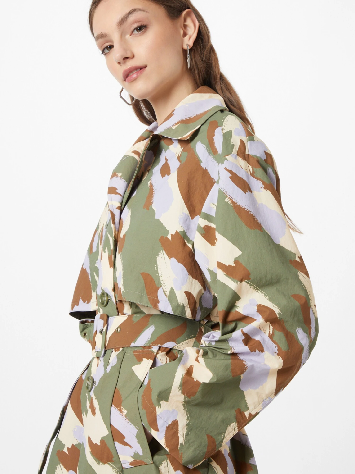 CamouflageTrenchcoatSplitCapuchon met trekkoordMet capuchonOvercut schouderTurn-down kraagZakken aan de zijkantTailleriemAll-over patroonLichte stofLicht gevoerdKnoopsluitingGerecycled polyamide