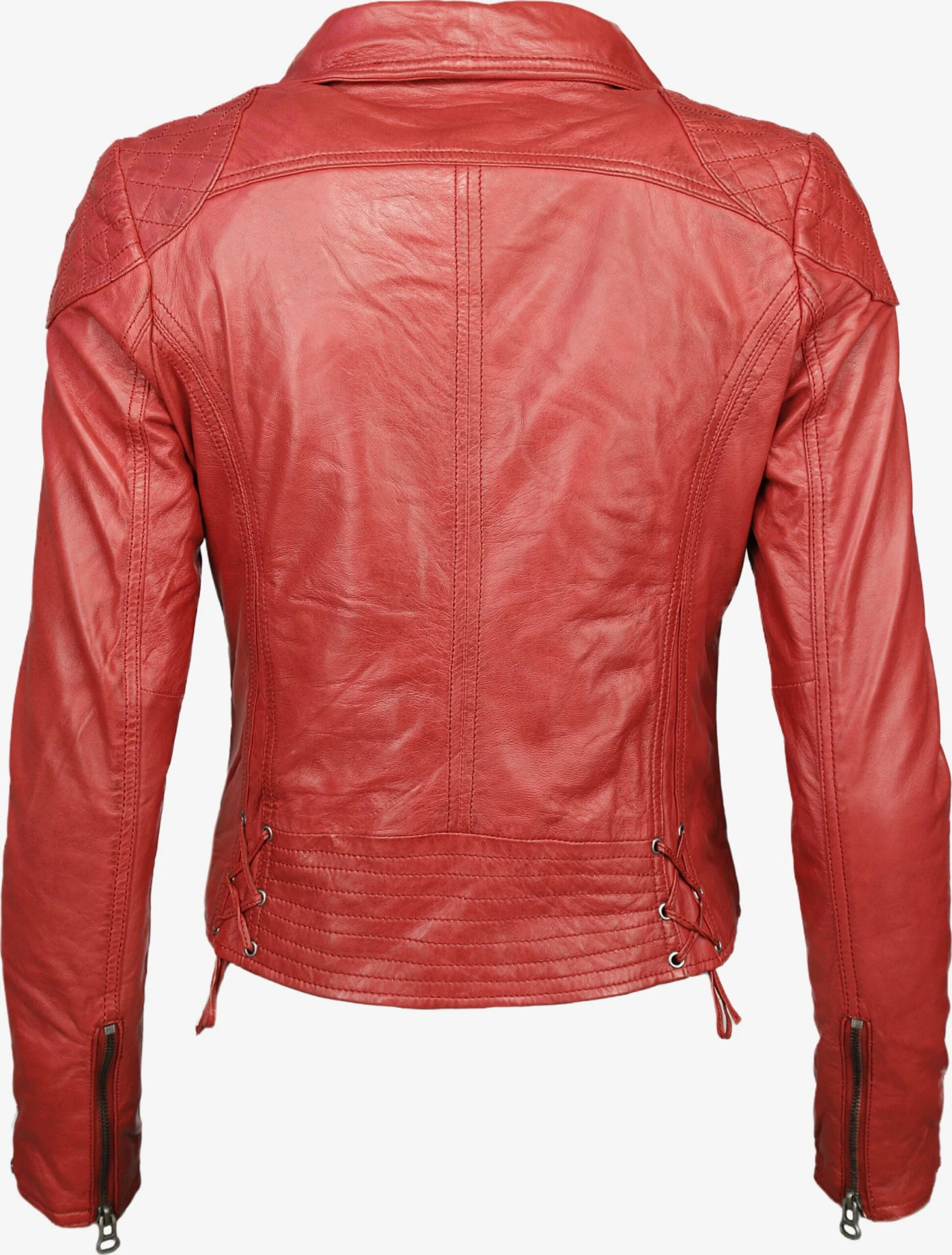 EffenLeerBikerjackMouw ritsRevers kraagVeteringRitszakken aan de zijkantSchuine ritsGlanzendOp staal nadenGladde stofLamsleerMetalen oogjesLicht gevoerd