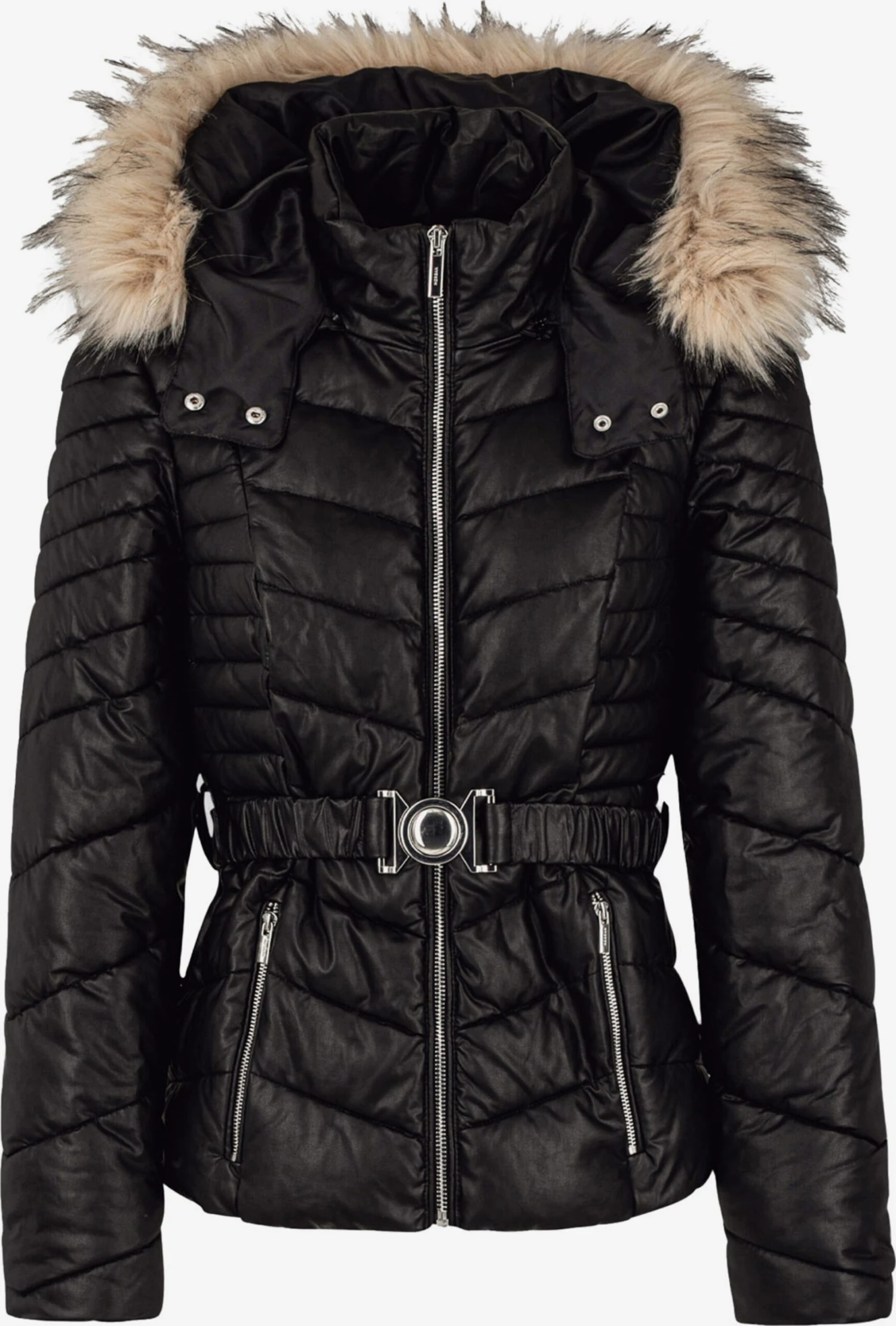 EffenGewatteerde jasRechte zoomCapuchon met opstaande kraagRitszakken aan de zijkantTailleriemStikselsOp staal nadenGladde stofRiemlussenWarm gevoerdRitssluiting