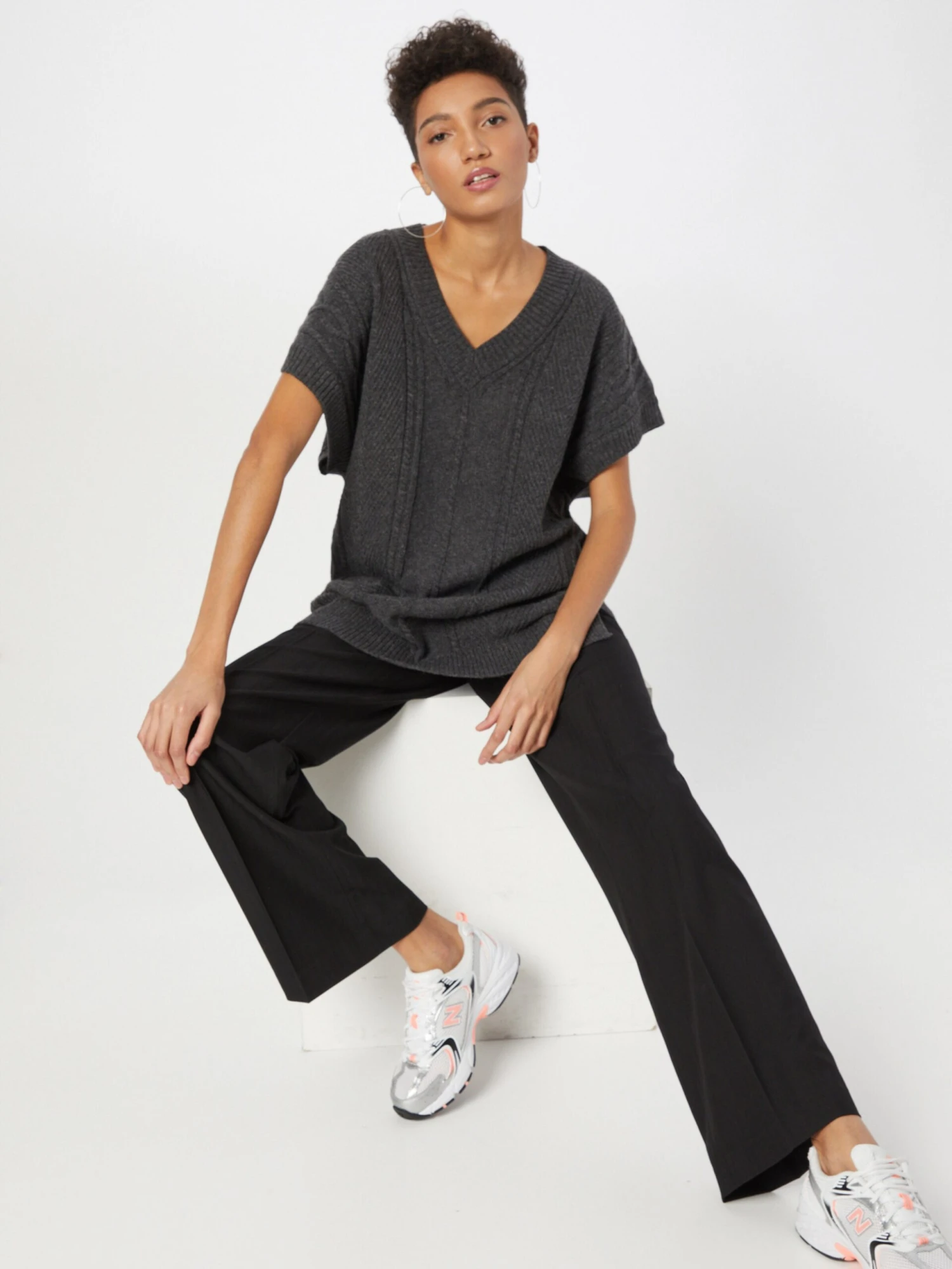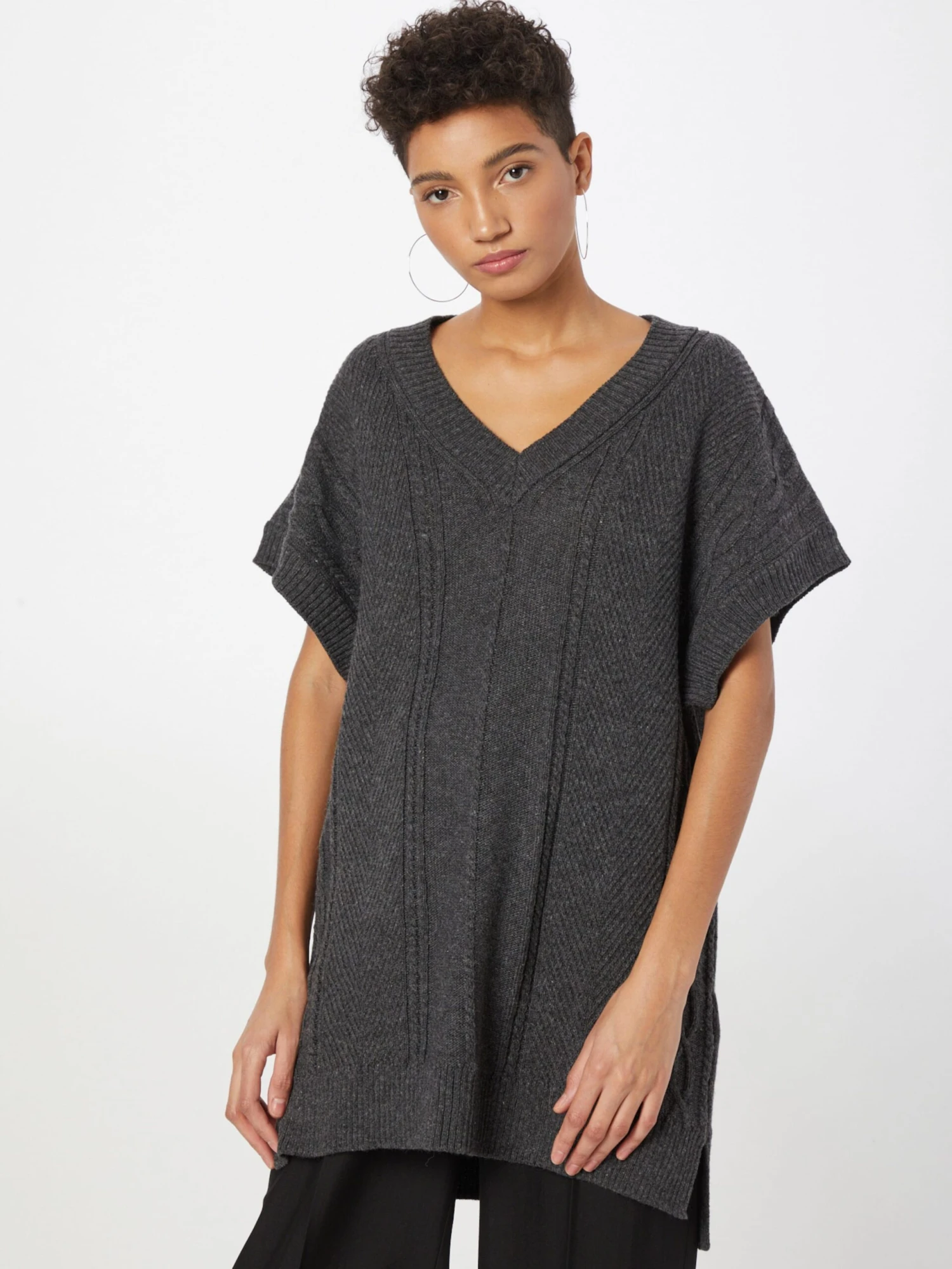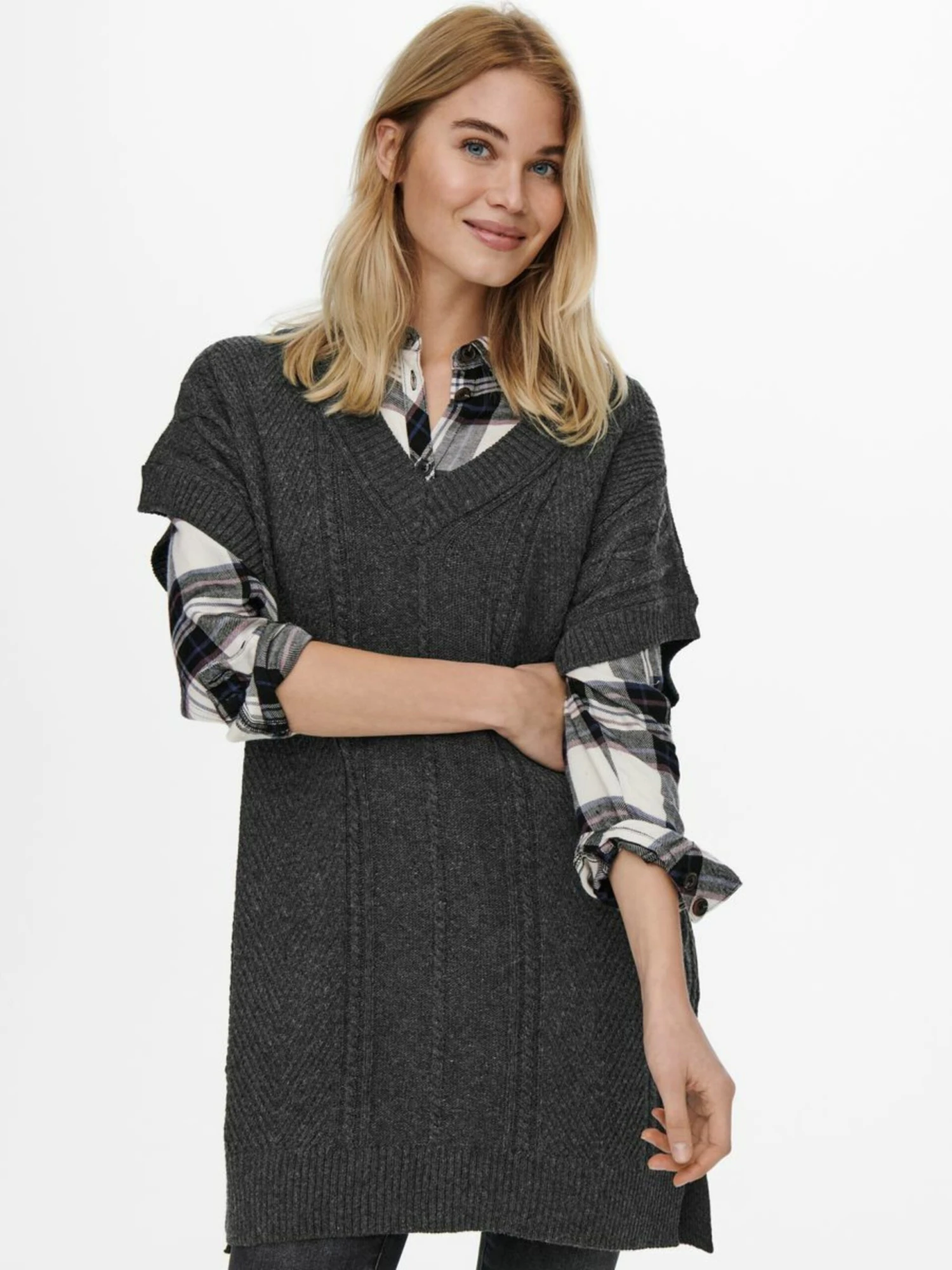 EffenV-halsGesneden mouwGeribbelde kraagGeribd ceintuurtjeZijdelingse inkepingenPatroon gebreidFully fashionedVoelt zacht aan