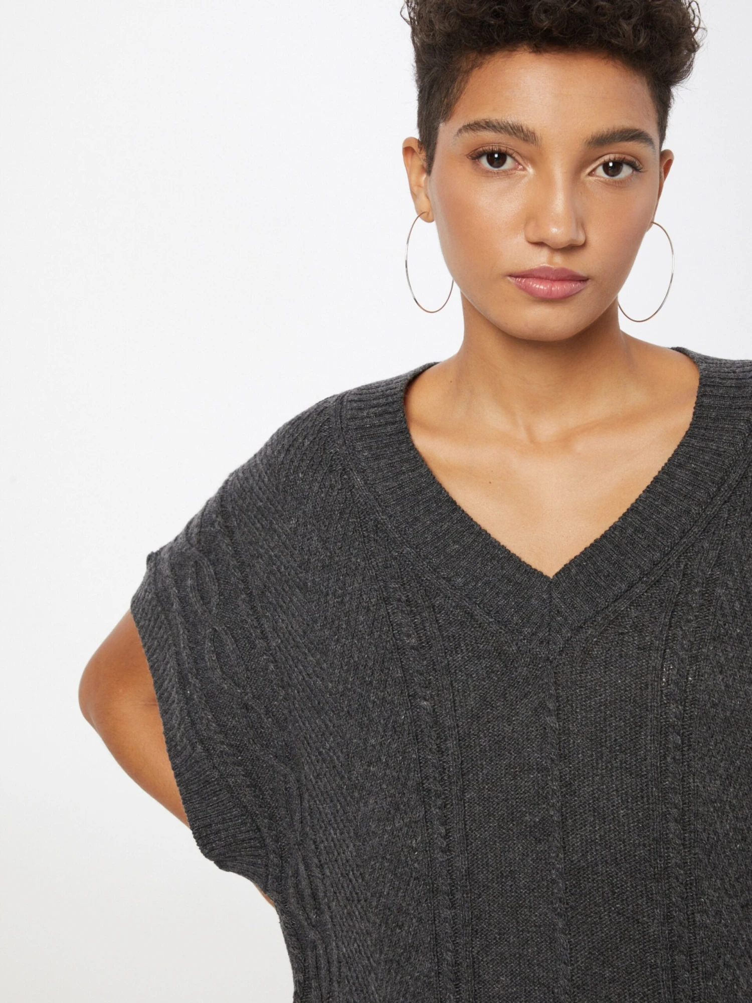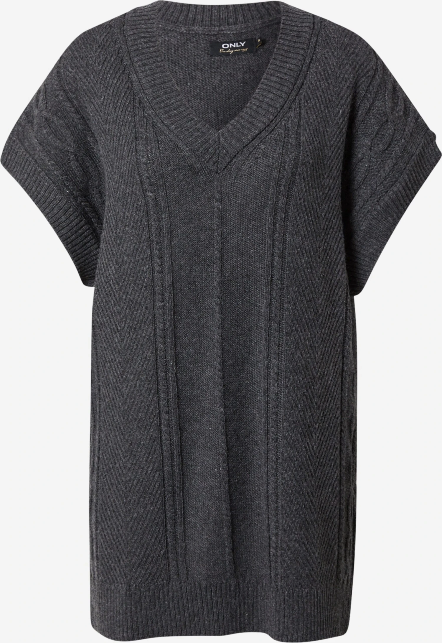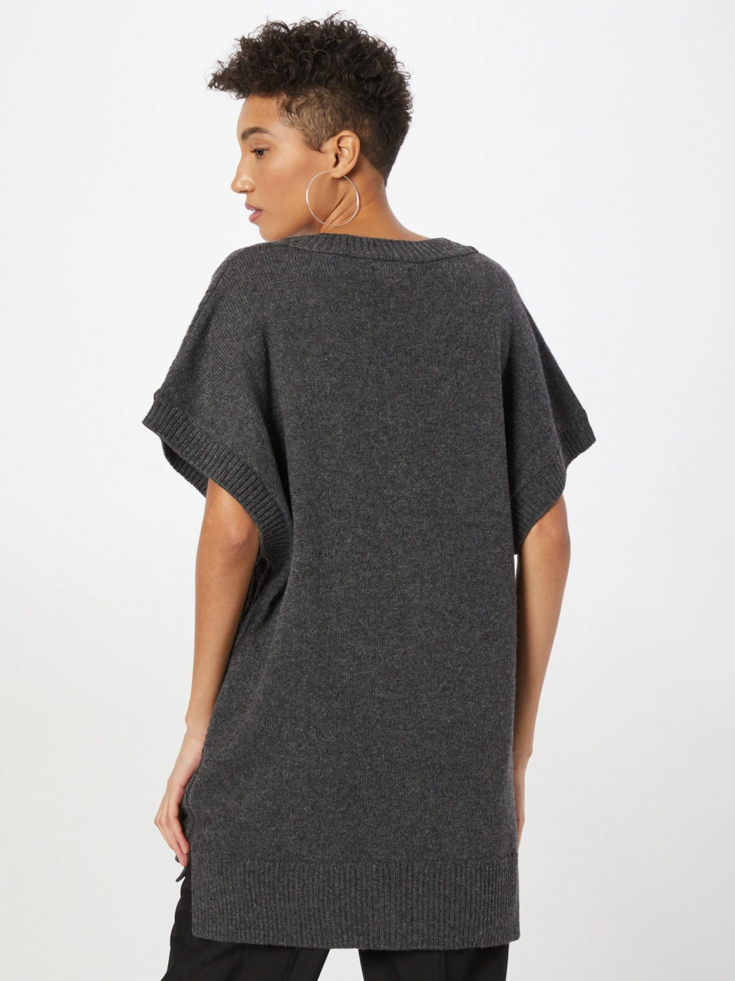 EffenV-halsGesneden mouwGeribbelde kraagGeribd ceintuurtjeZijdelingse inkepingenPatroon gebreidFully fashionedVoelt zacht aan