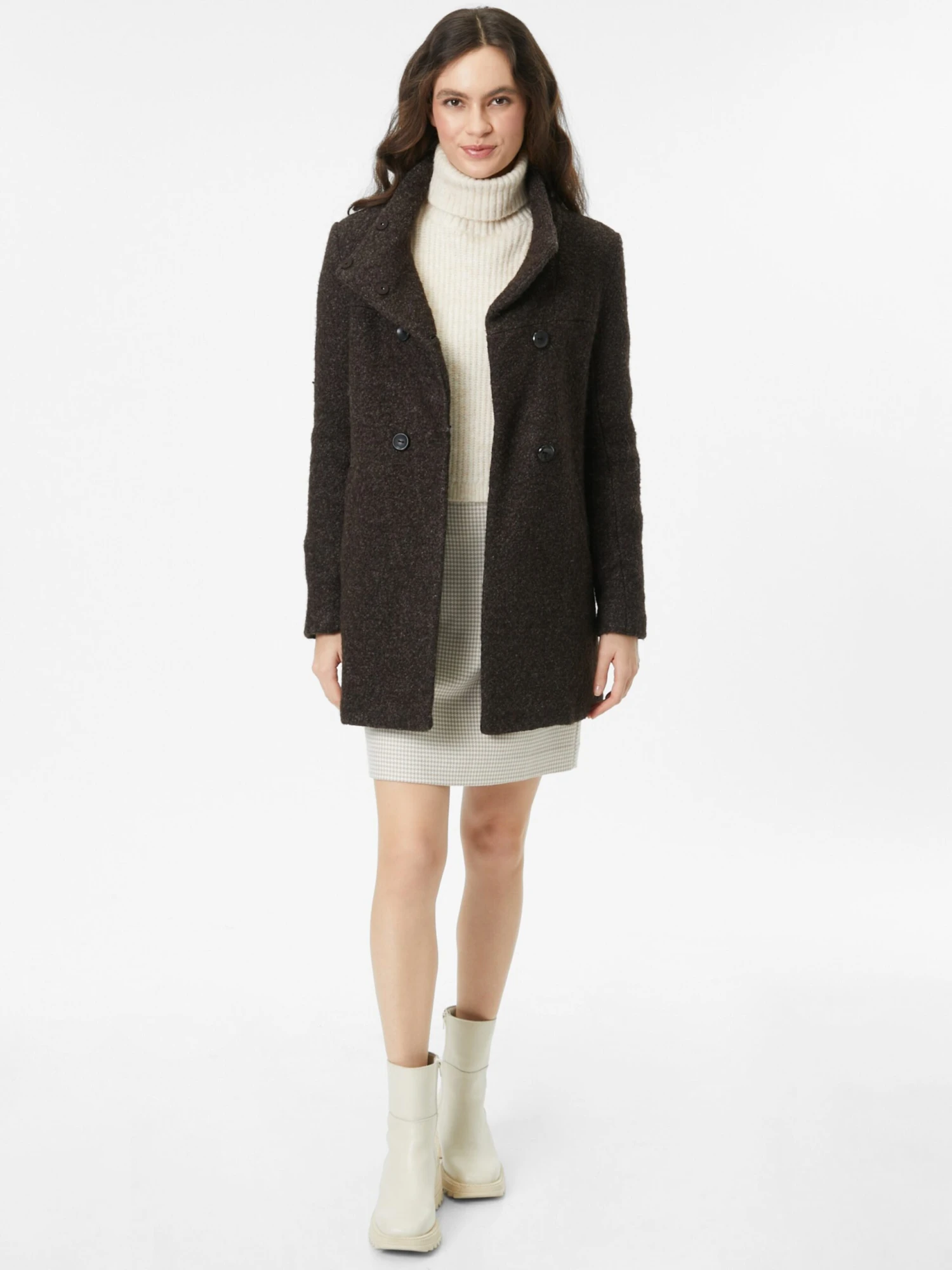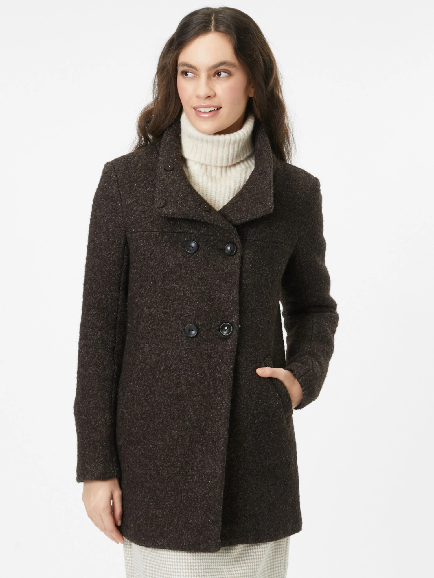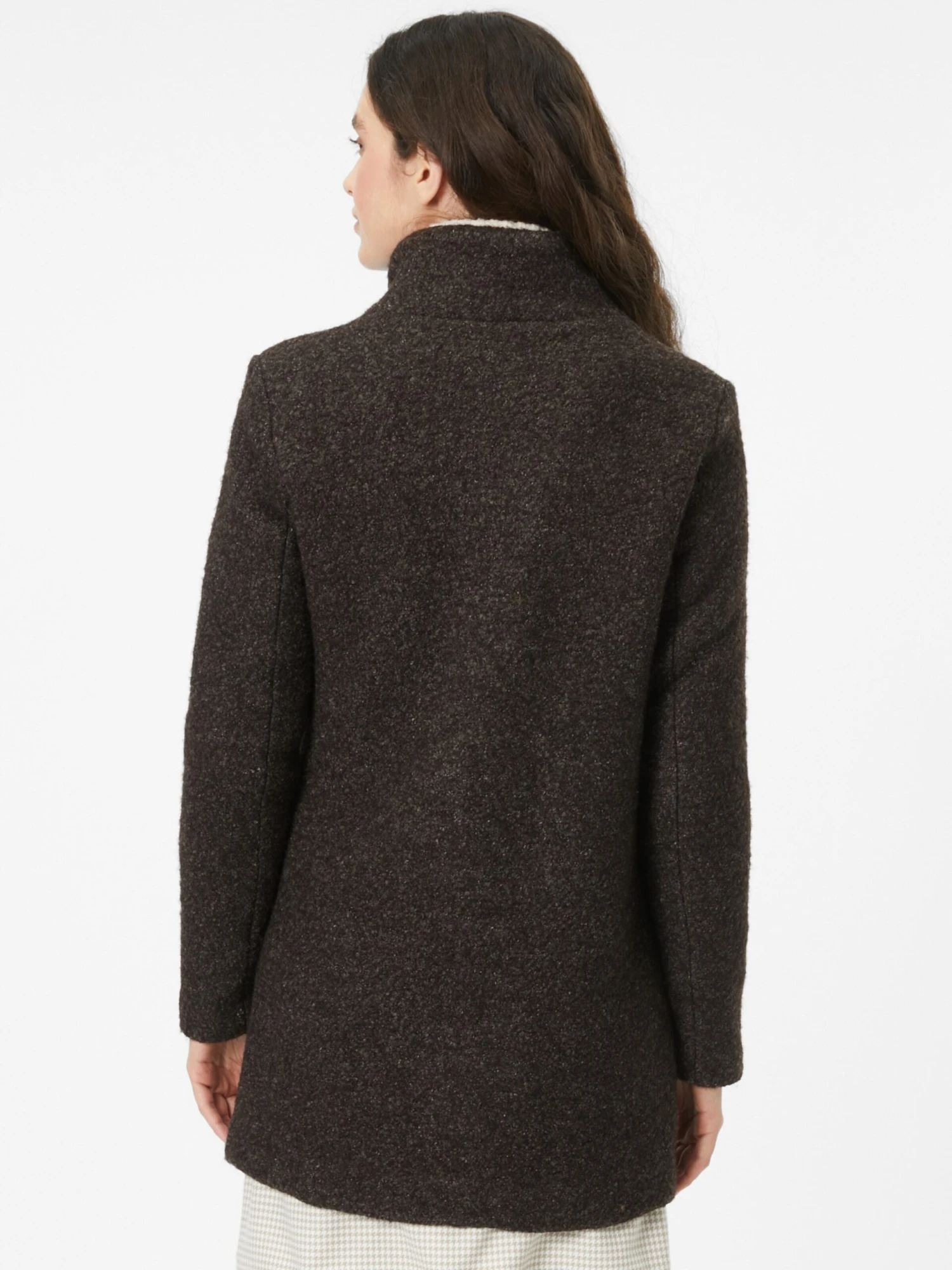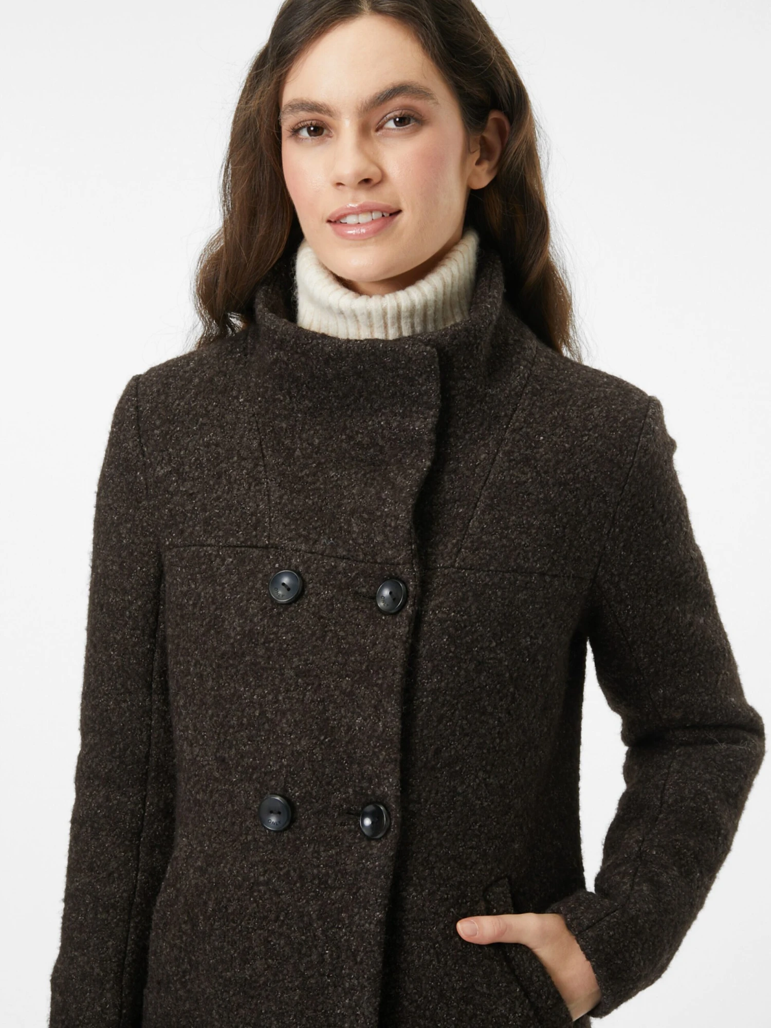 MélangeKlassieke mantelRechte zoomKnop placketStaande kraagZakken aan de zijkantOp staal nadenVoelt zacht aanLicht gevoerdKnoopsluiting