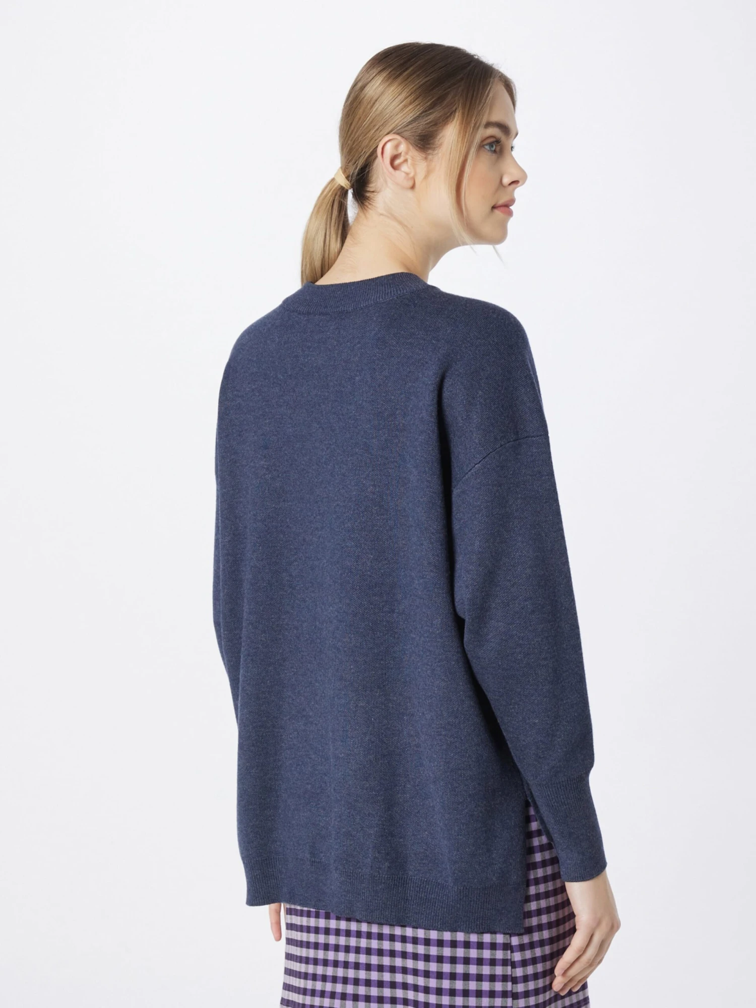 MélangeViscoseRonde halsGeribbelde kraagGeribd ceintuurtjeZijdelingse inkepingenOvercut schouderFully fashionedOp staal nadenLENZING™ ECOVERO™ Viscose*