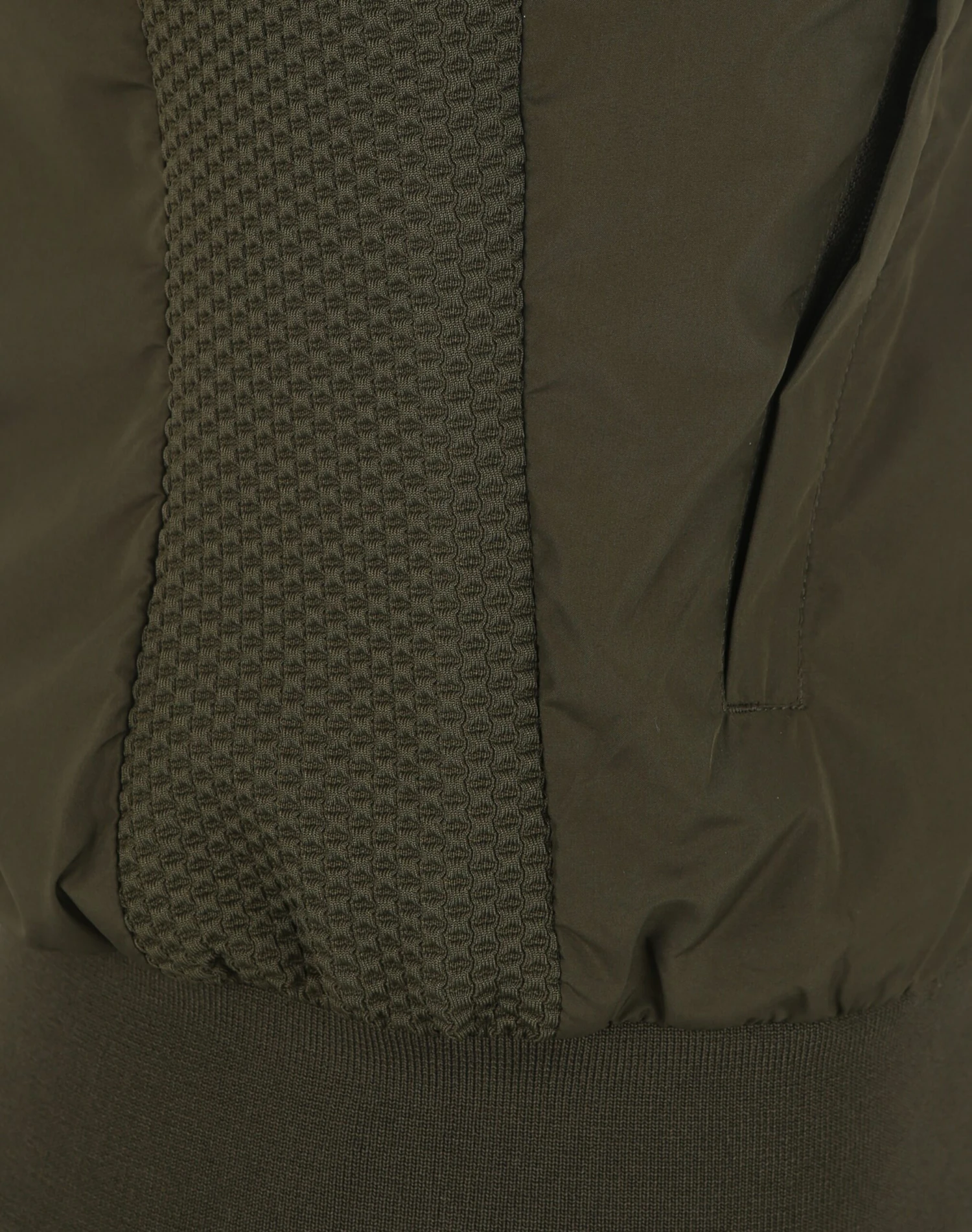 EffenBomberjackRitssluitingGeribbelde kraagRechte zoomGeribd ceintuurtjeRitszakken aan de zijkantElastische inzetstukkenOp staal nadenVoelt zacht aanLicht gevoerdRitssluiting