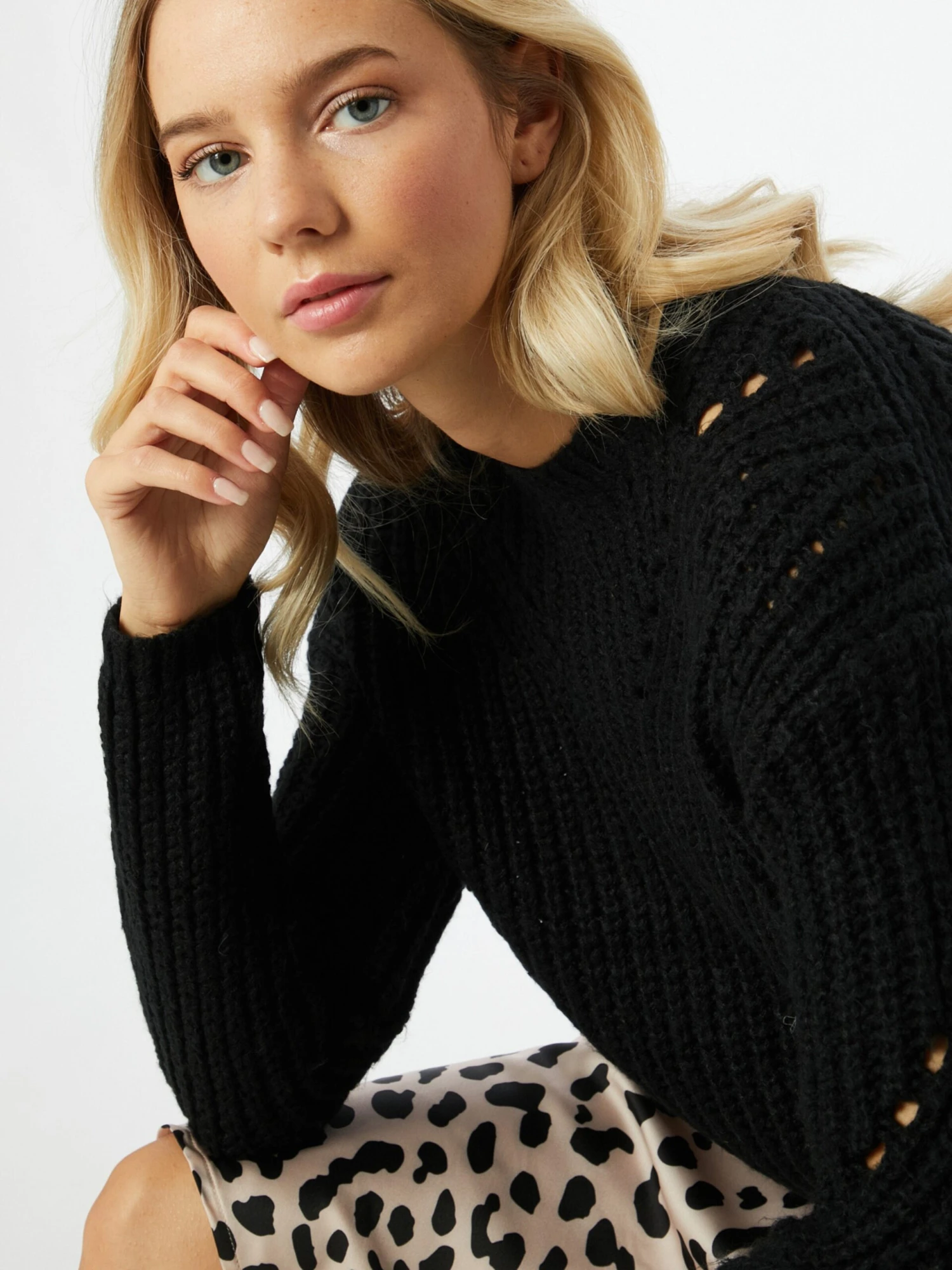 EffenRonde halsMeshGeribbelde kraagElastische taille/zoomGeribd ceintuurtjeOvercut schouderPatroon gebreidMet textuurVoelt zacht aan