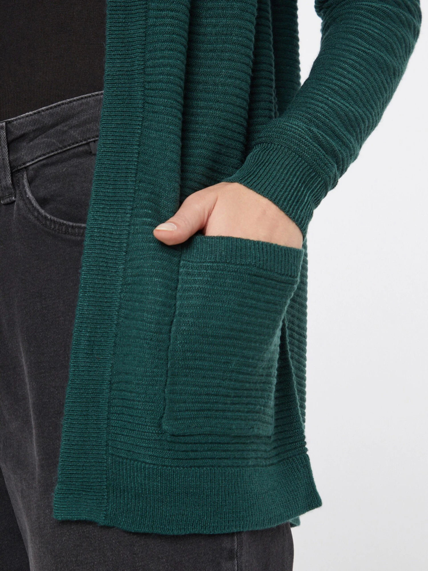 EffenGeribbelde kraagGeribd ceintuurtjeOpgezette zakkenZonder sluitingMet textuurVoelt zacht aanOpen