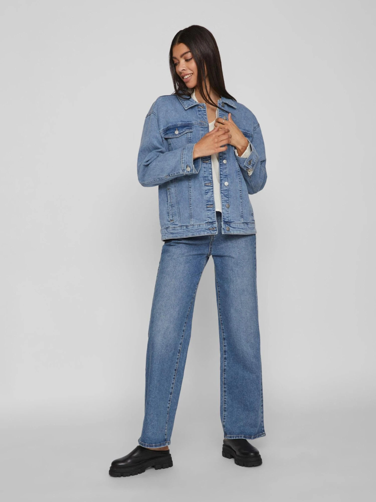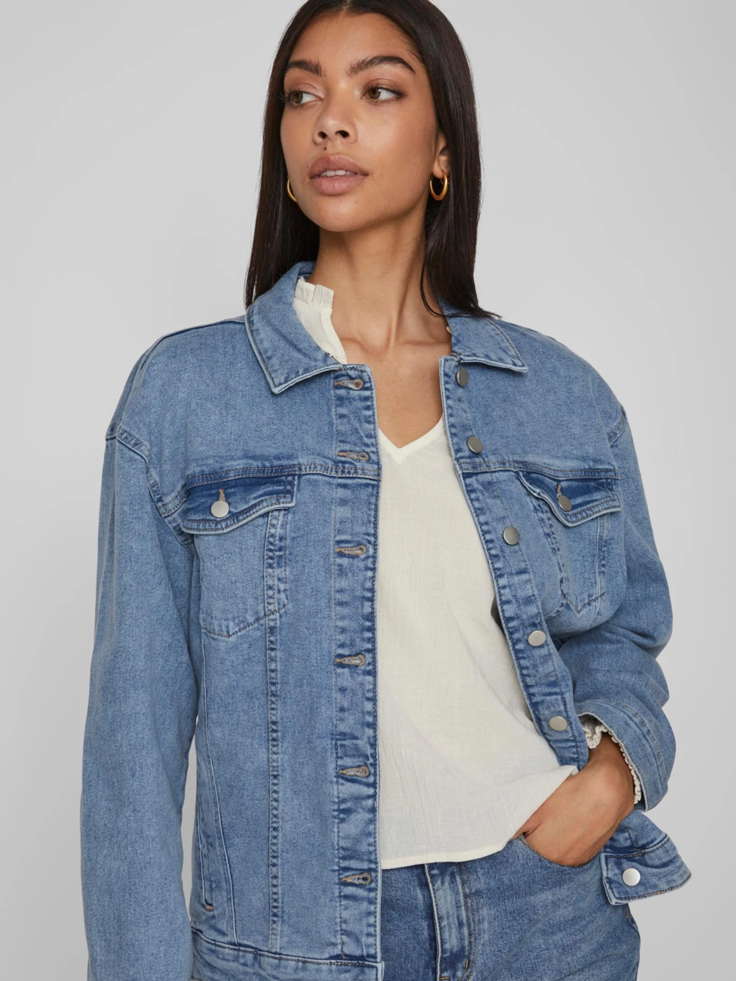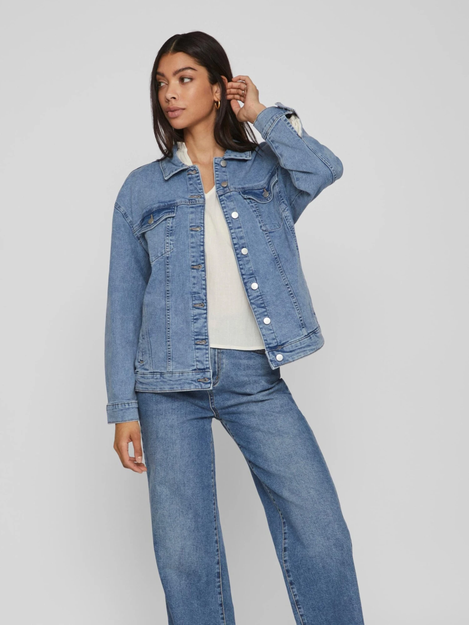 EffenDenim1-knoops manchettenRechte manchettenKnop placketDeelnadenTurn-down kraagBorstzakZakken aan de zijkantOp staal nadenGewassen effectStevige stofNiet gevoerdKnoopsluiting